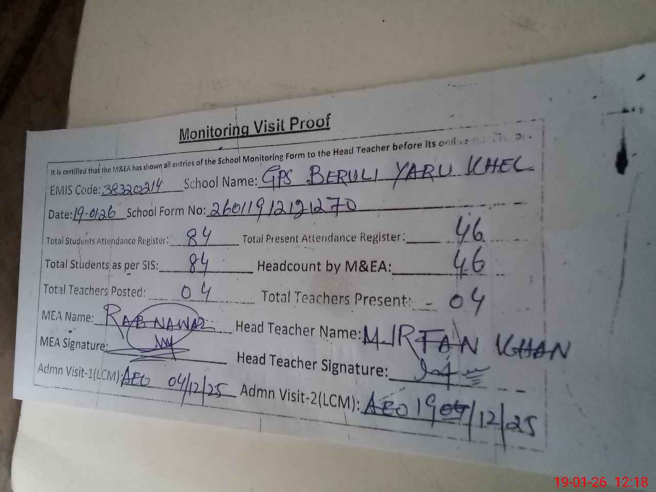 | Attendance Register | Head Teacher | MEA with School | Visit Proof |