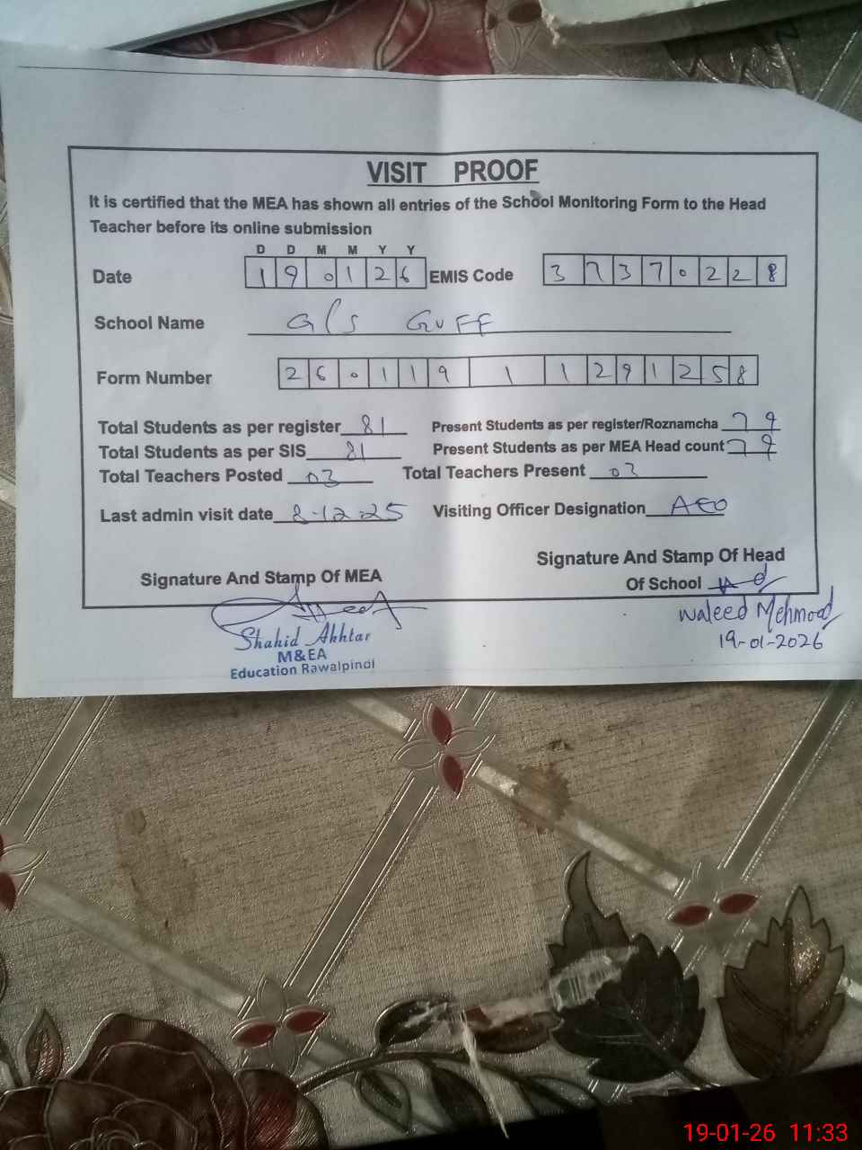 | Attendance Register | Head Teacher | MEA with School | Visit Proof |