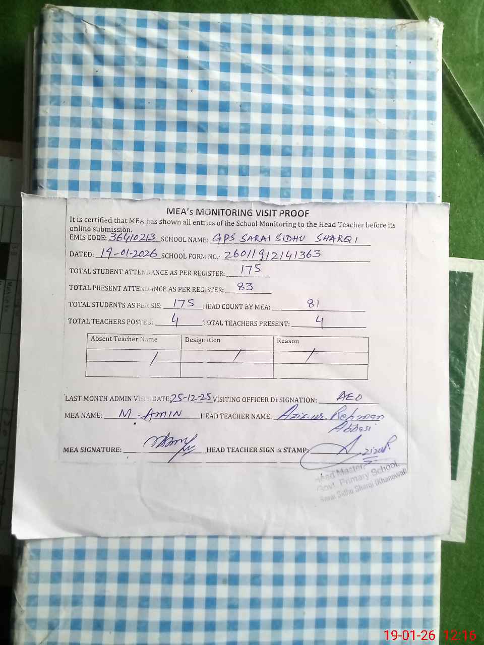 | Attendance Register | Head Teacher | MEA with School | Visit Proof |