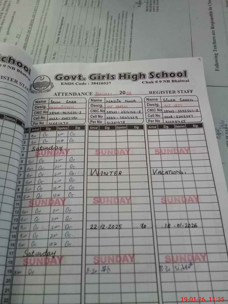 | CNIC | Full Name | Designation | R/C | Absence during last cal. month |