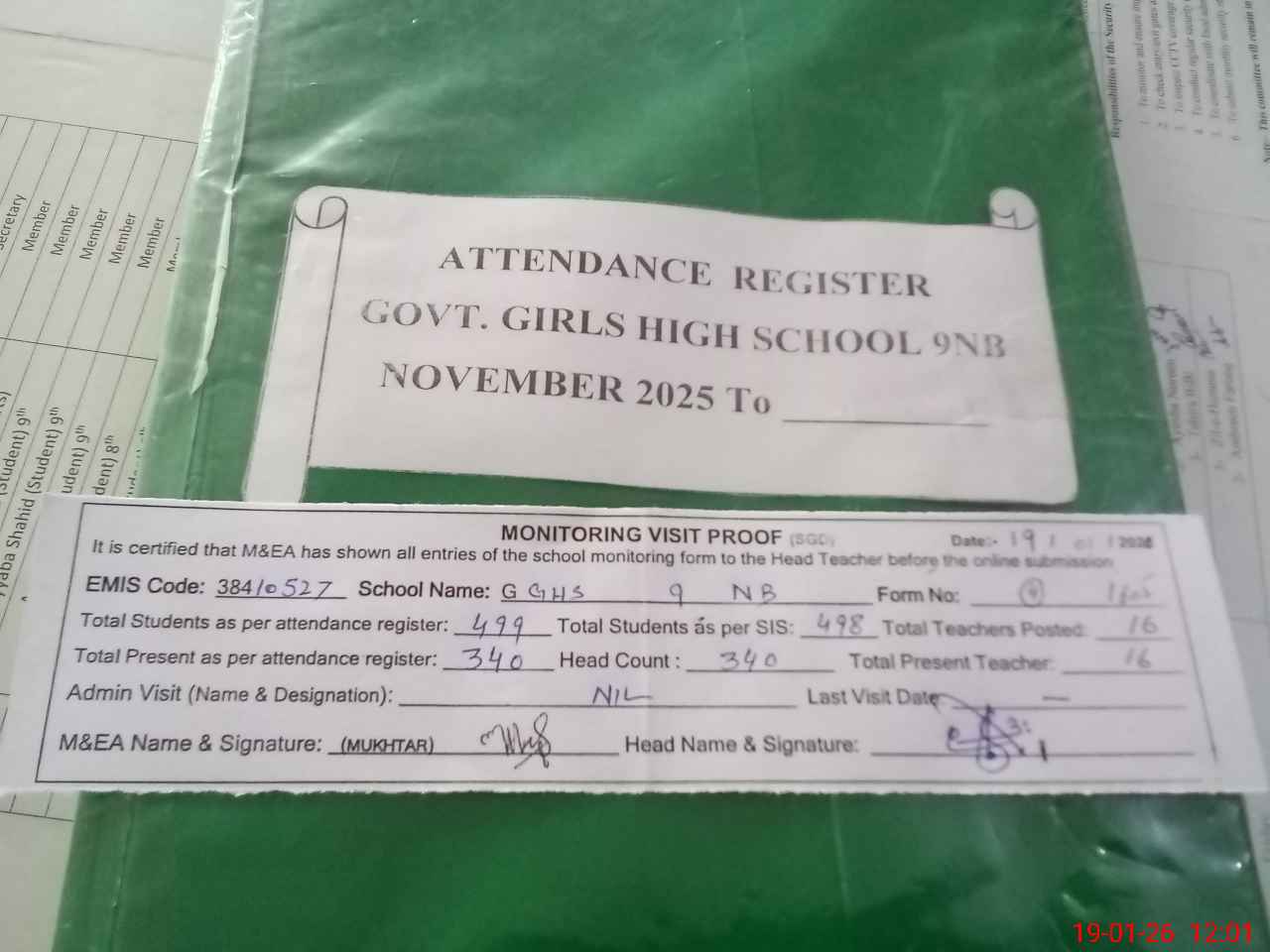 | Attendance Register | Head Teacher | MEA with School | Visit Proof |