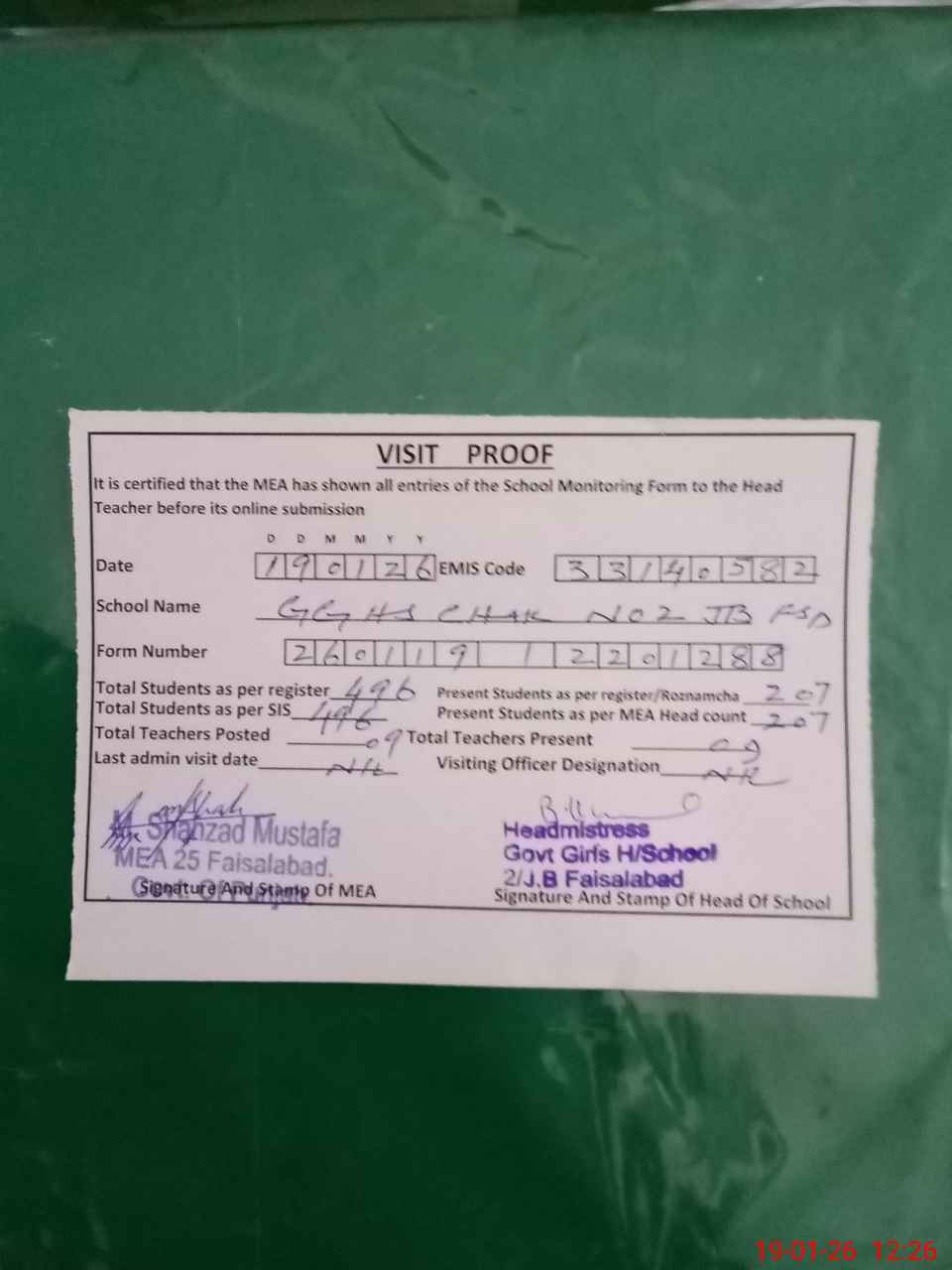 | Attendance Register | Head Teacher | MEA with School | Visit Proof |