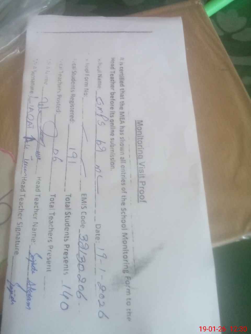 | Attendance Register | Head Teacher | MEA with School | Visit Proof |