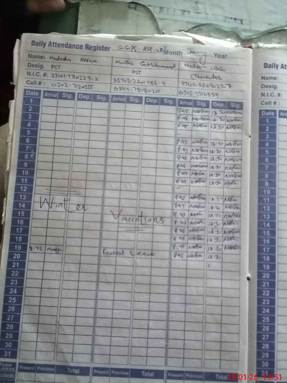 | CNIC | Full Name | Designation | R/C | Absence during last cal. month |