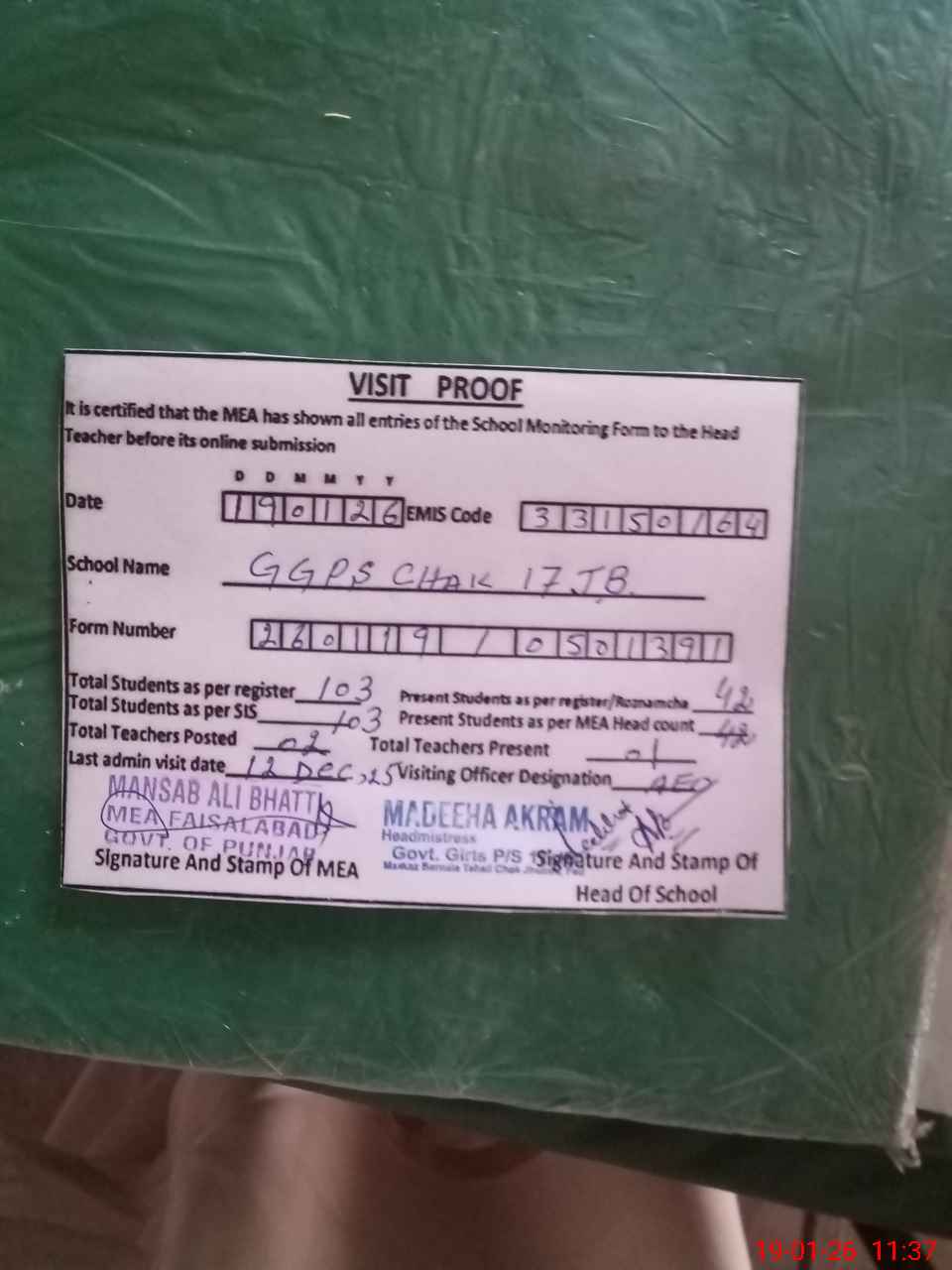| Attendance Register | Head Teacher | MEA with School | Visit Proof |