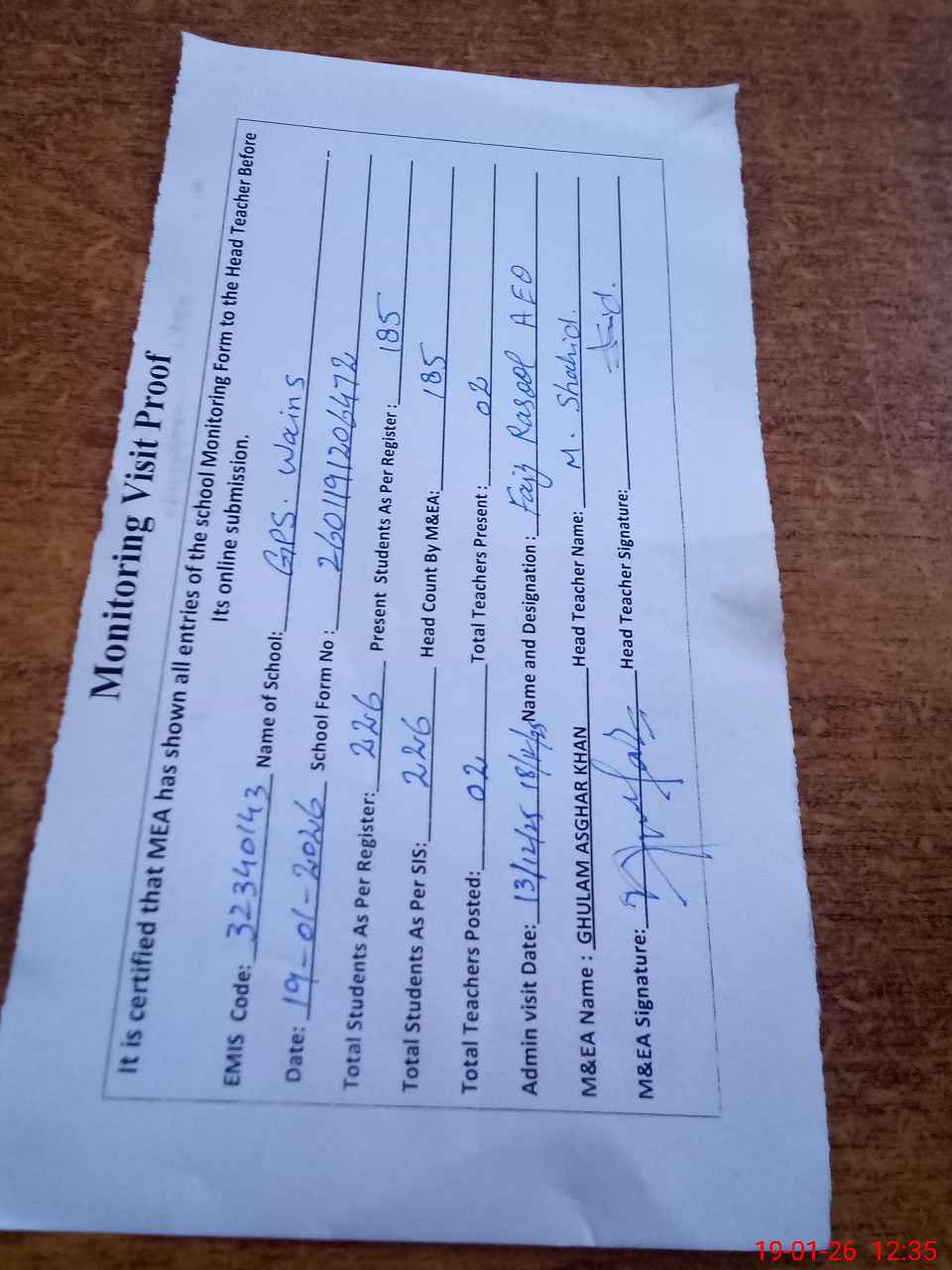| Attendance Register | Head Teacher | MEA with School | Visit Proof |