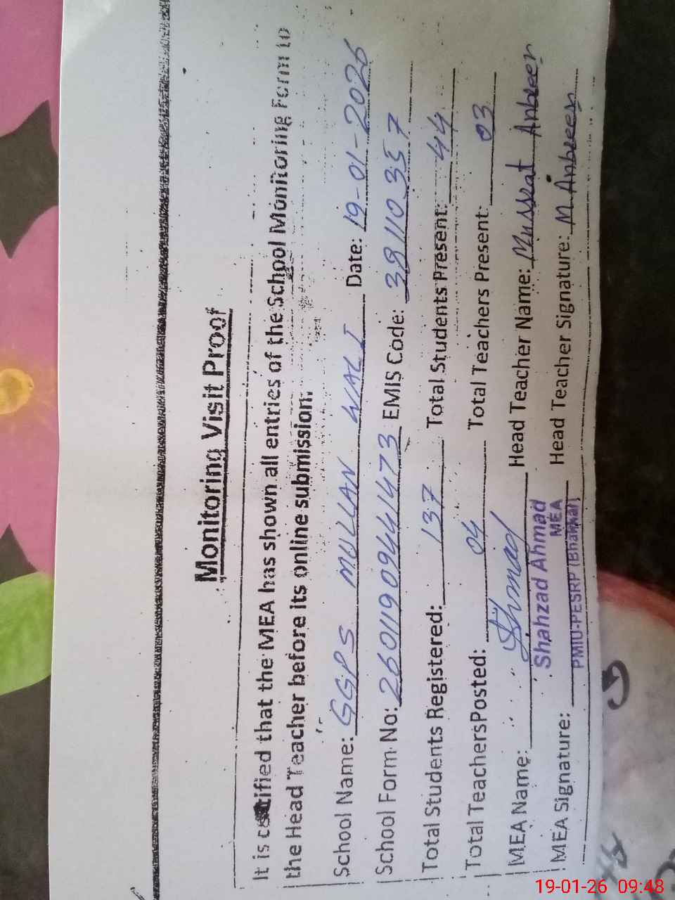| Certified that this School was Inspected by the Undersigned MEA/DMO Today and the Information Stated Above is as Per Record. | |||||