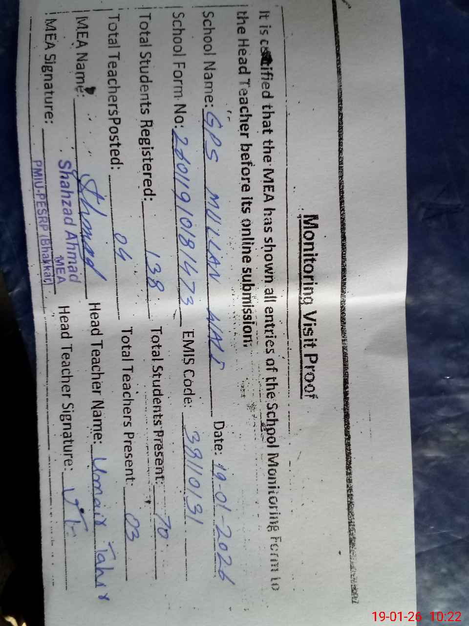 | Name: Um**** Ta**** Designation: (School Headmaster's/Headmistress's) PTC/JV Phone/Cell Number: 03**** |