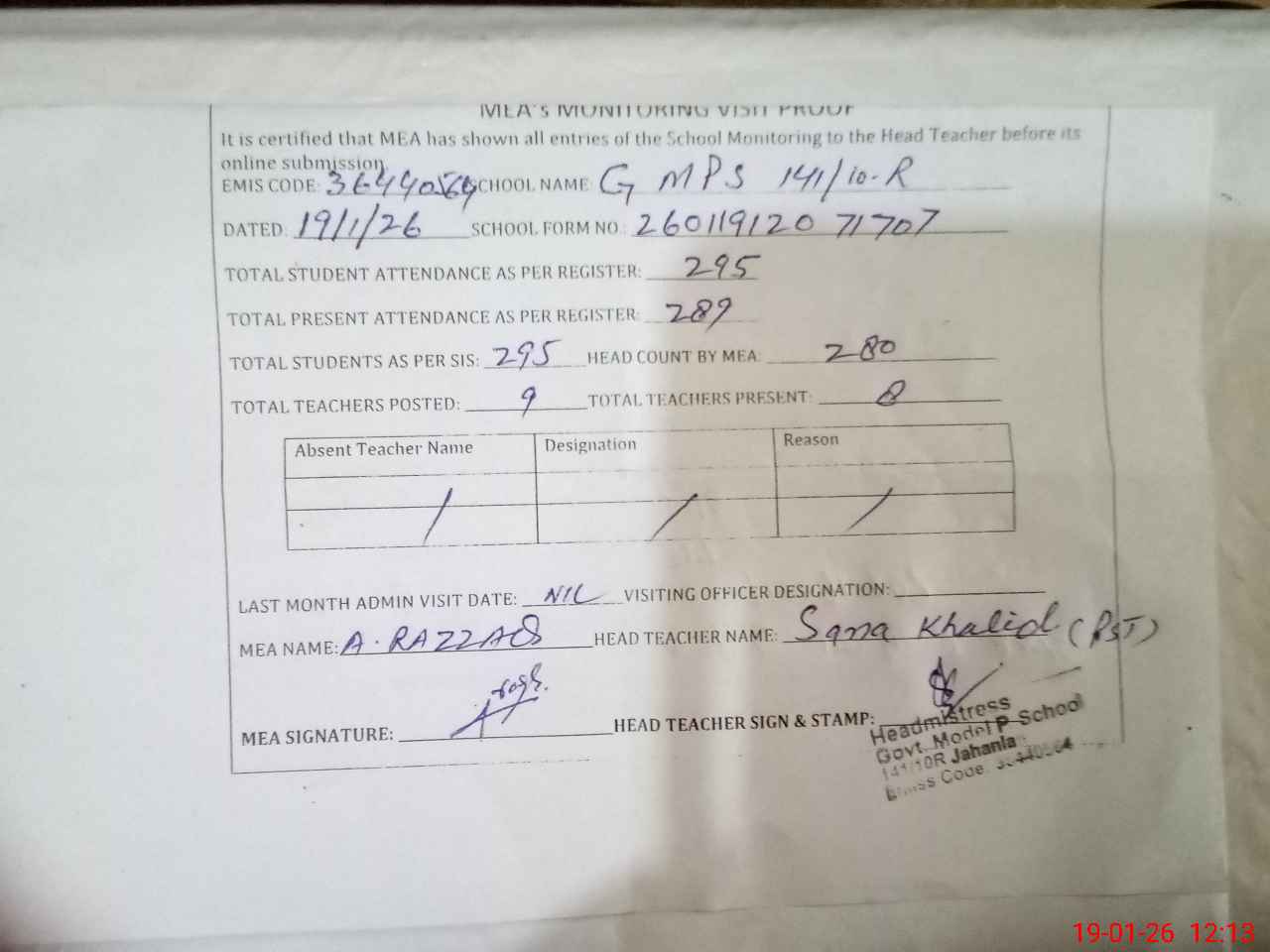 | Attendance Register | Head Teacher | MEA with School | Visit Proof |