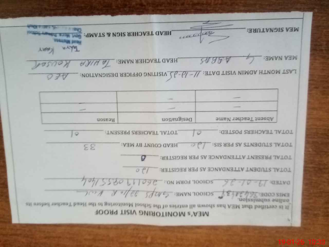 | Attendance Register | Head Teacher | MEA with School | Visit Proof |