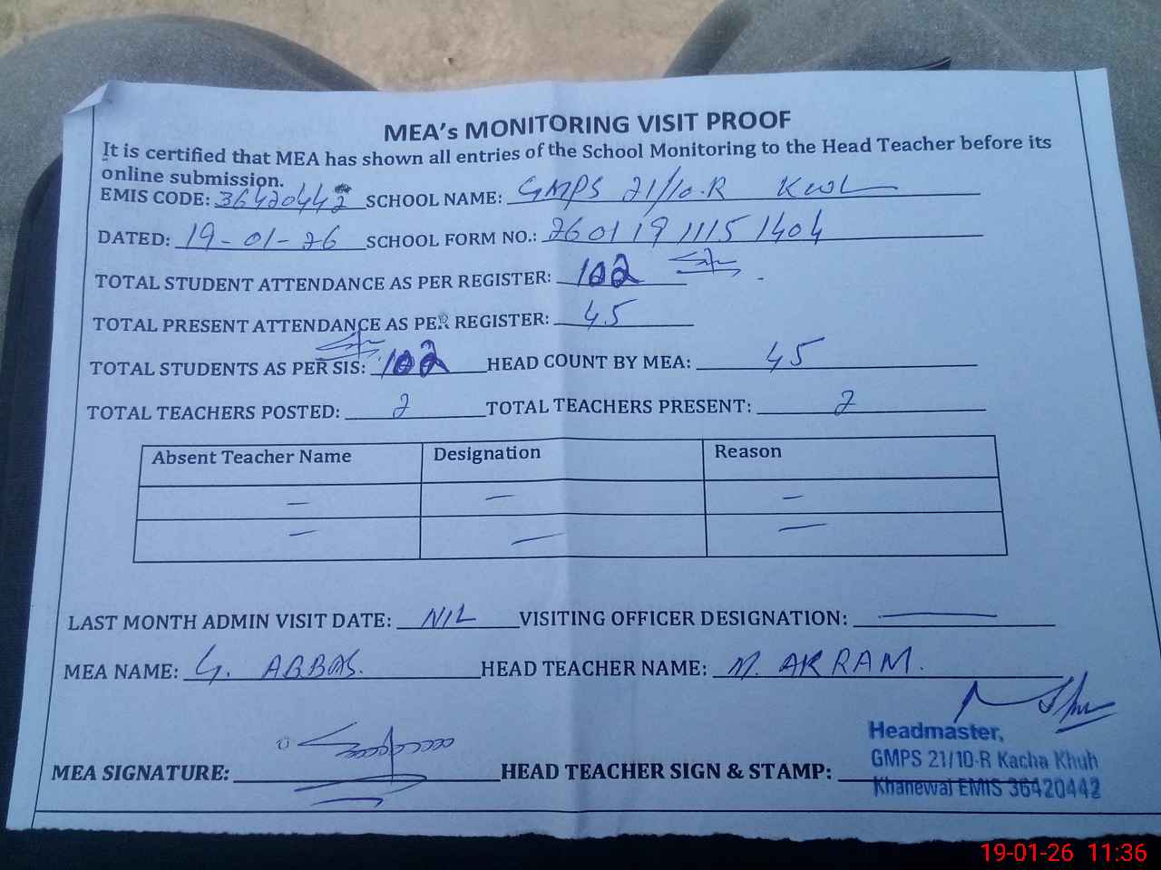 | Attendance Register | Head Teacher | MEA with School | Visit Proof |