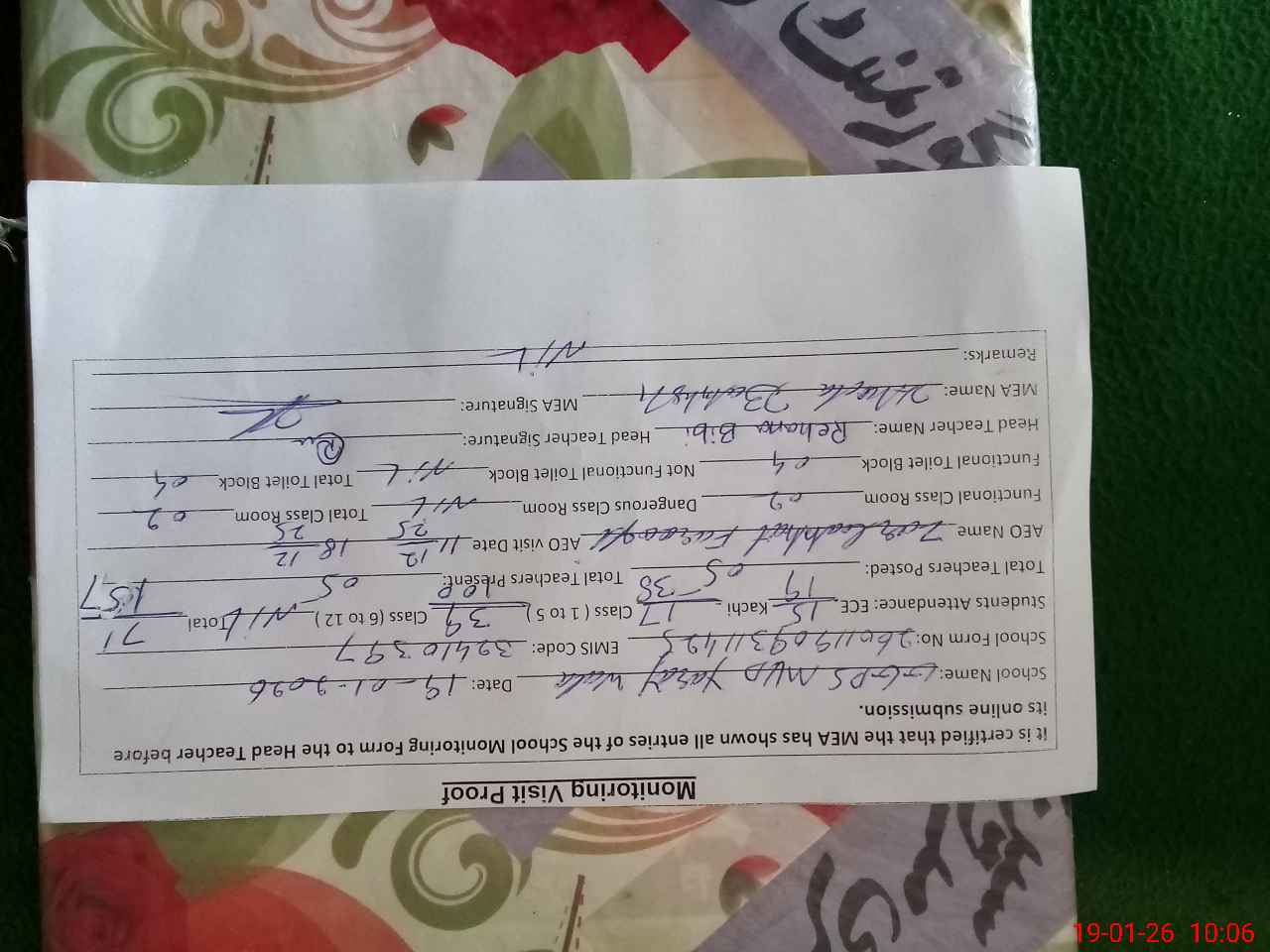 | Certified that this School was Inspected by the Undersigned MEA/DMO Today and the Information Stated Above is as Per Record. | |||||