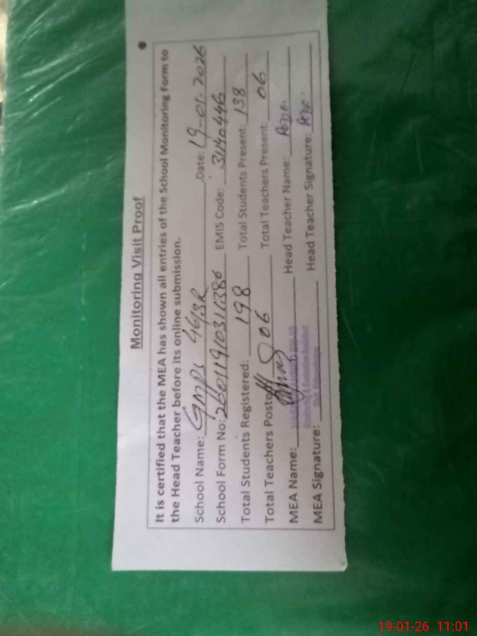 | Attendance Register | Head Teacher | MEA with School | Visit Proof |