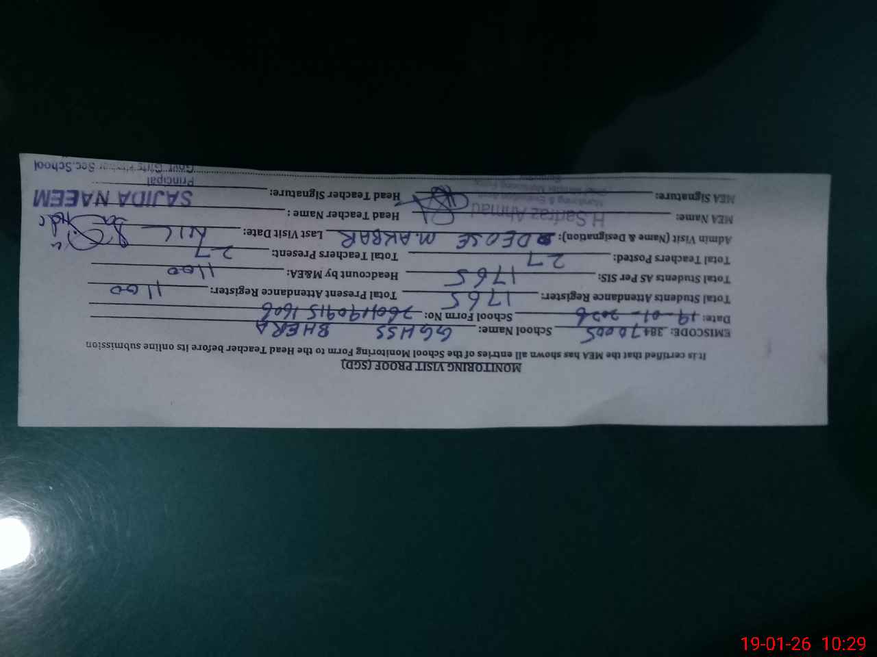 | Attendance Register | Head Teacher | MEA with School | Visit Proof |