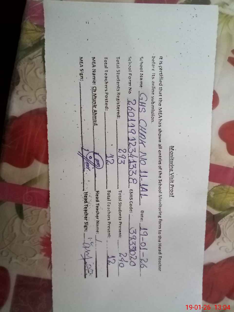 | Attendance Register | Head Teacher | MEA with School | Visit Proof |