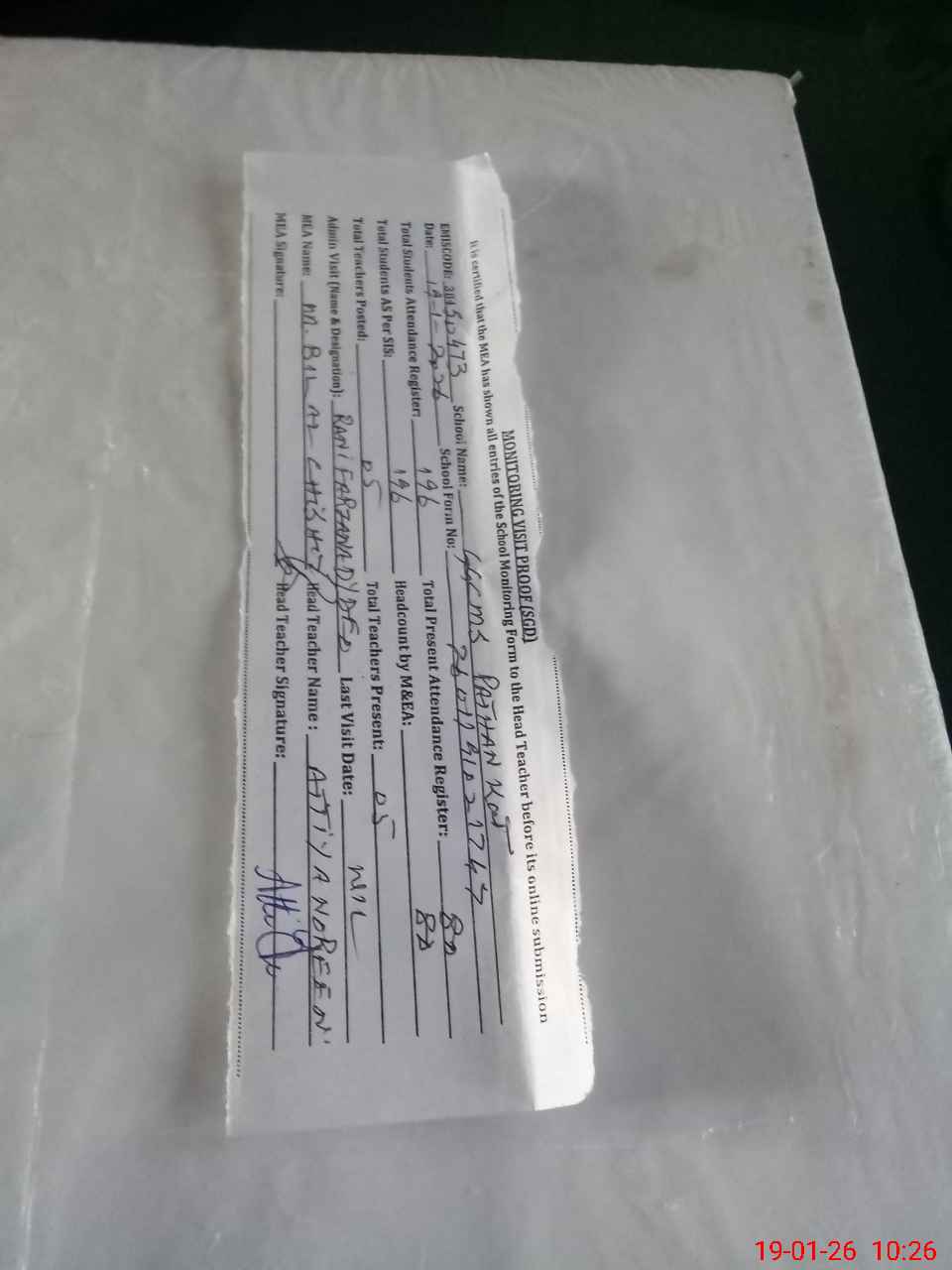 | Attendance Register | Head Teacher | MEA with School | Visit Proof |