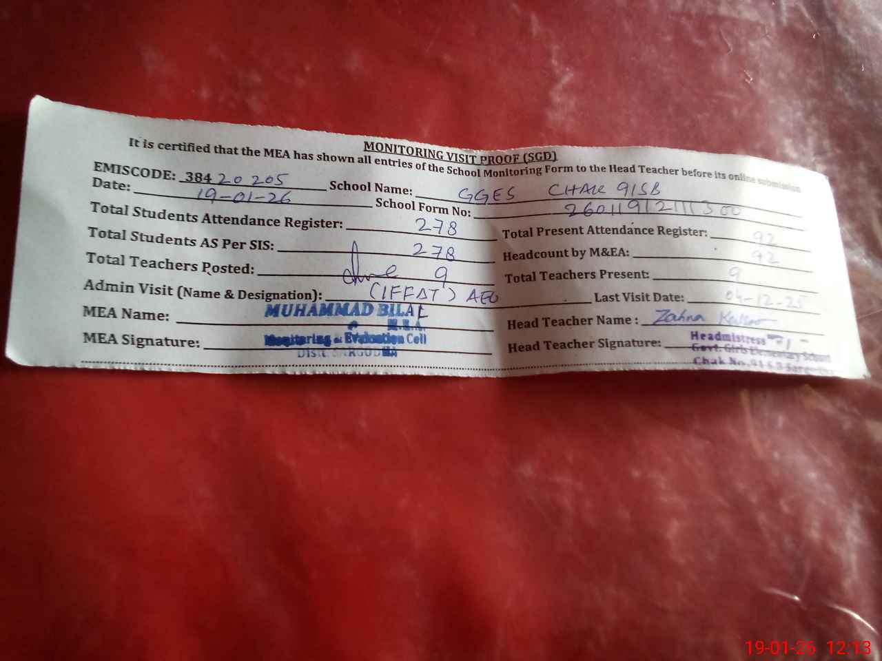 | Attendance Register | Head Teacher | MEA with School | Visit Proof |