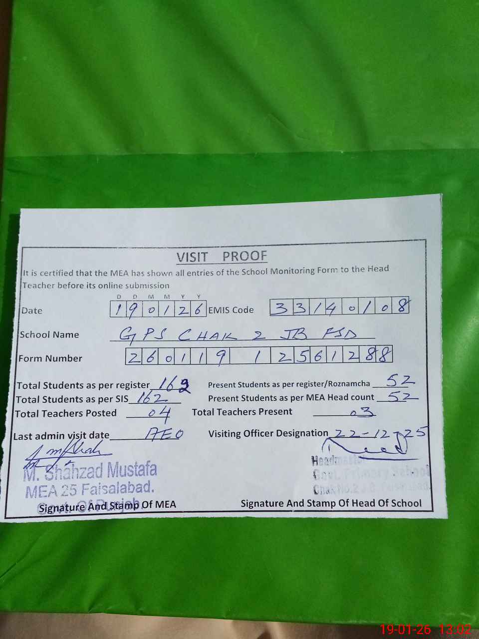 | EMIS Code: 33140108 | Name of School: GPS CHAK 2 JB | |||