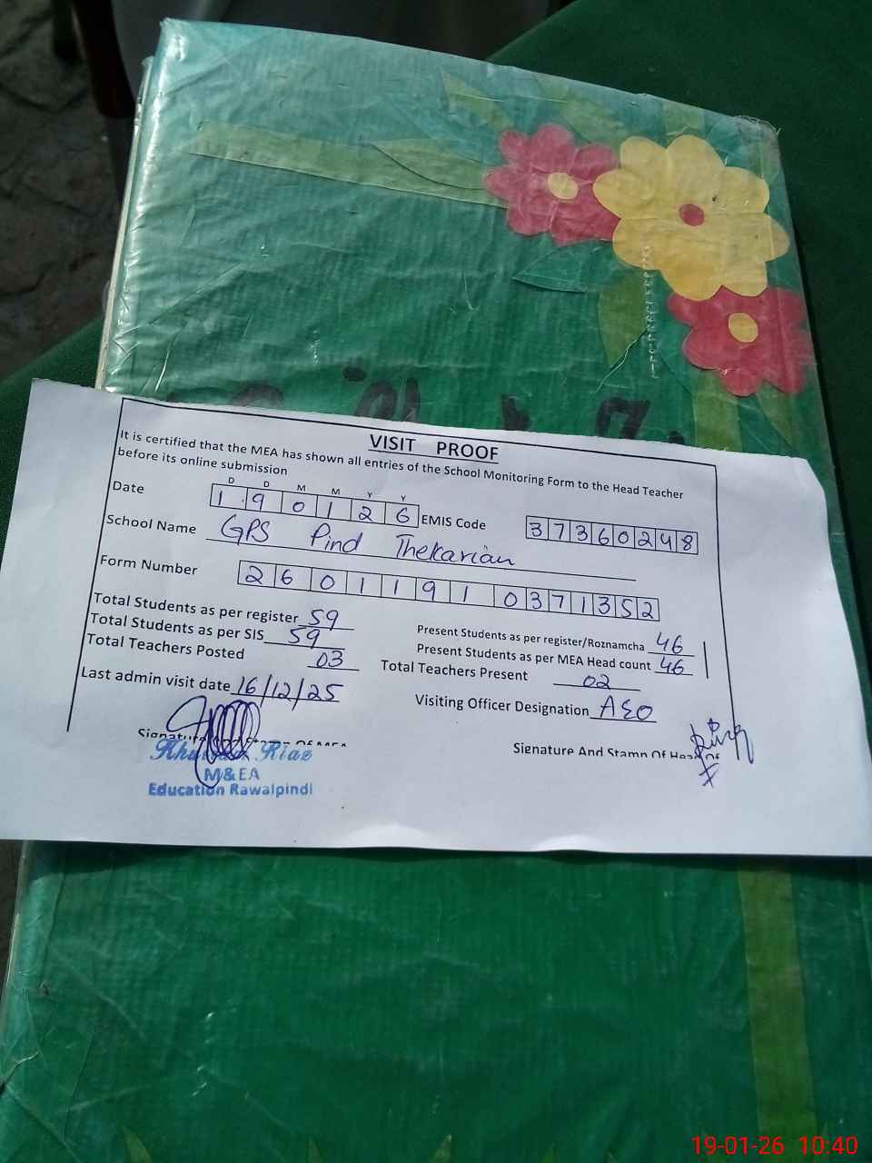| Certified that this School was Inspected by the Undersigned MEA/DMO Today and the Information Stated Above is as Per Record. | |||||