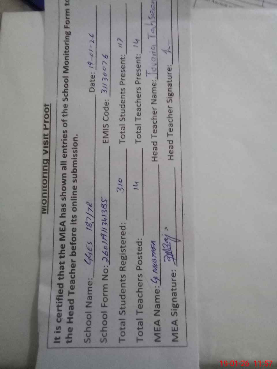 | Attendance Register | Head Teacher | MEA with School | Visit Proof |