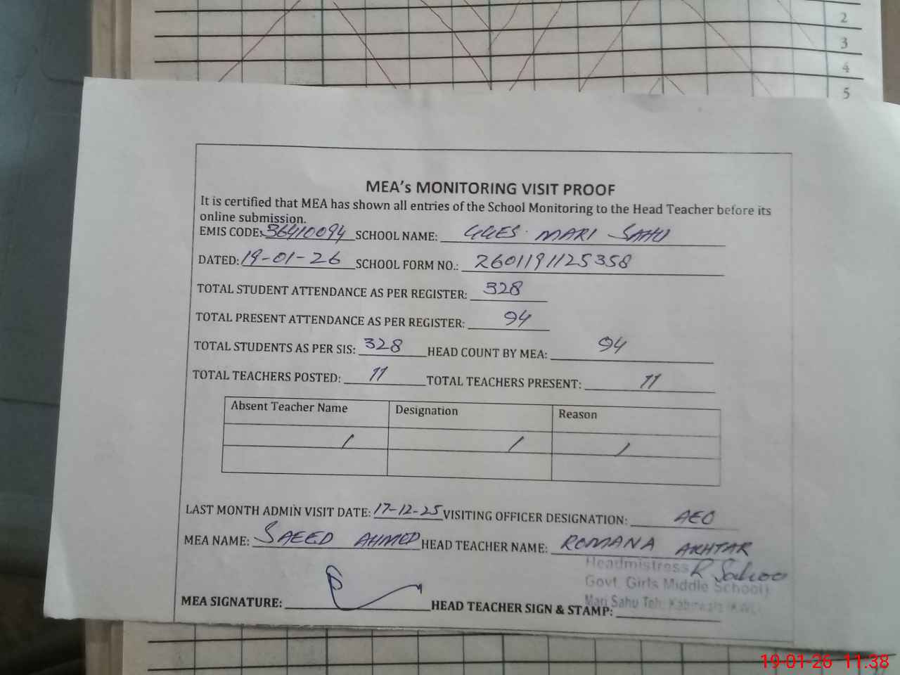 | Attendance Register | Head Teacher | MEA with School | Visit Proof |