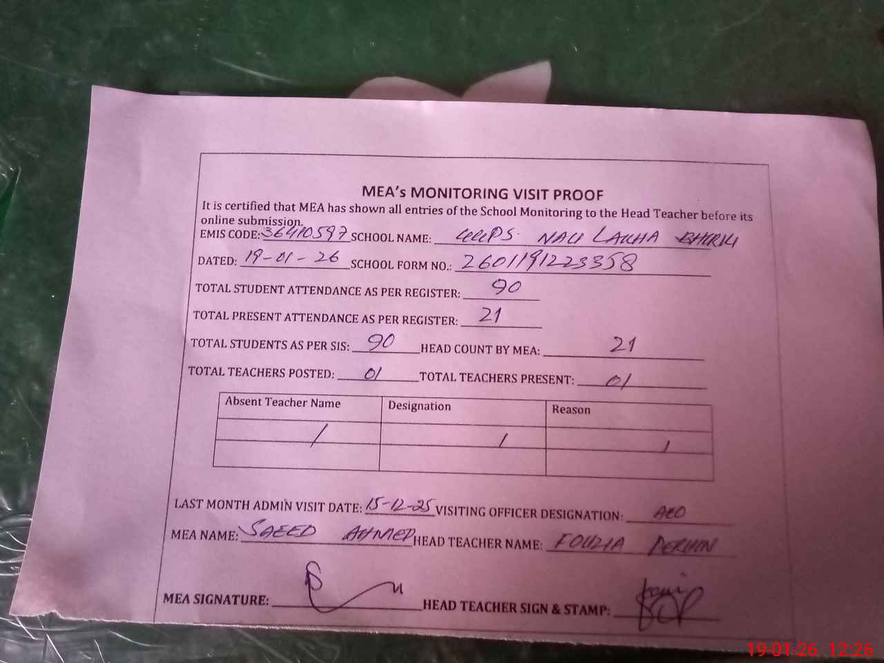 | Attendance Register | Head Teacher | MEA with School | Visit Proof |