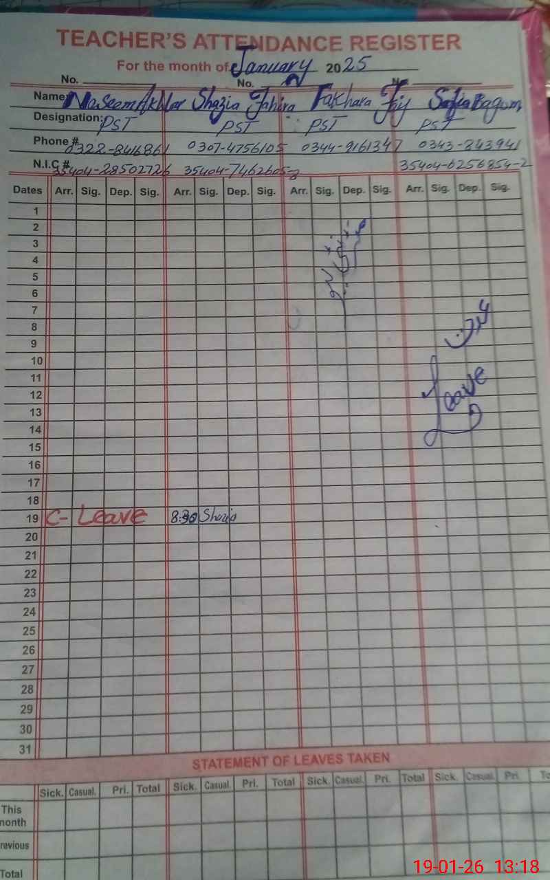 | 38**** | Sa**** Ch**** | PST Arts | Regular | 0 | 0 | 0 | 0 | 0 | 0 | 0 | 0 | 0 | Absent (Un-Authorized) |