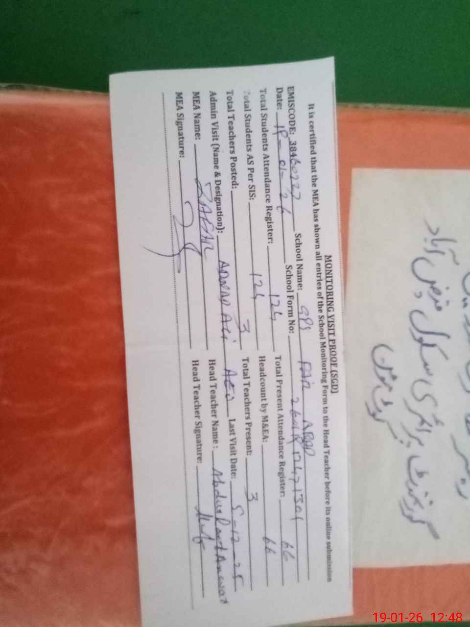 | Attendance Register | Head Teacher | MEA with School | Visit Proof |