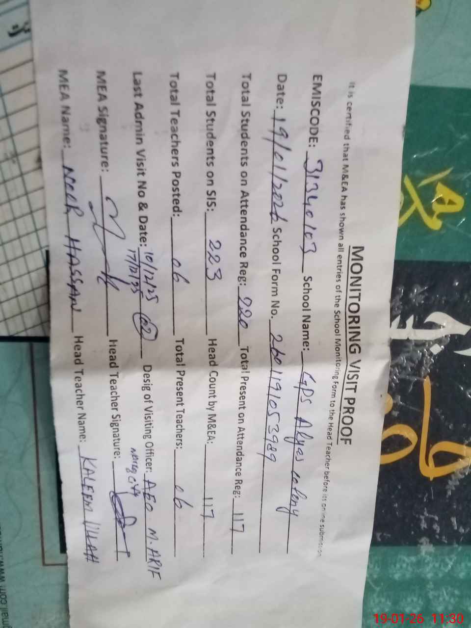 | Attendance Register | Head Teacher | MEA with School | Visit Proof |