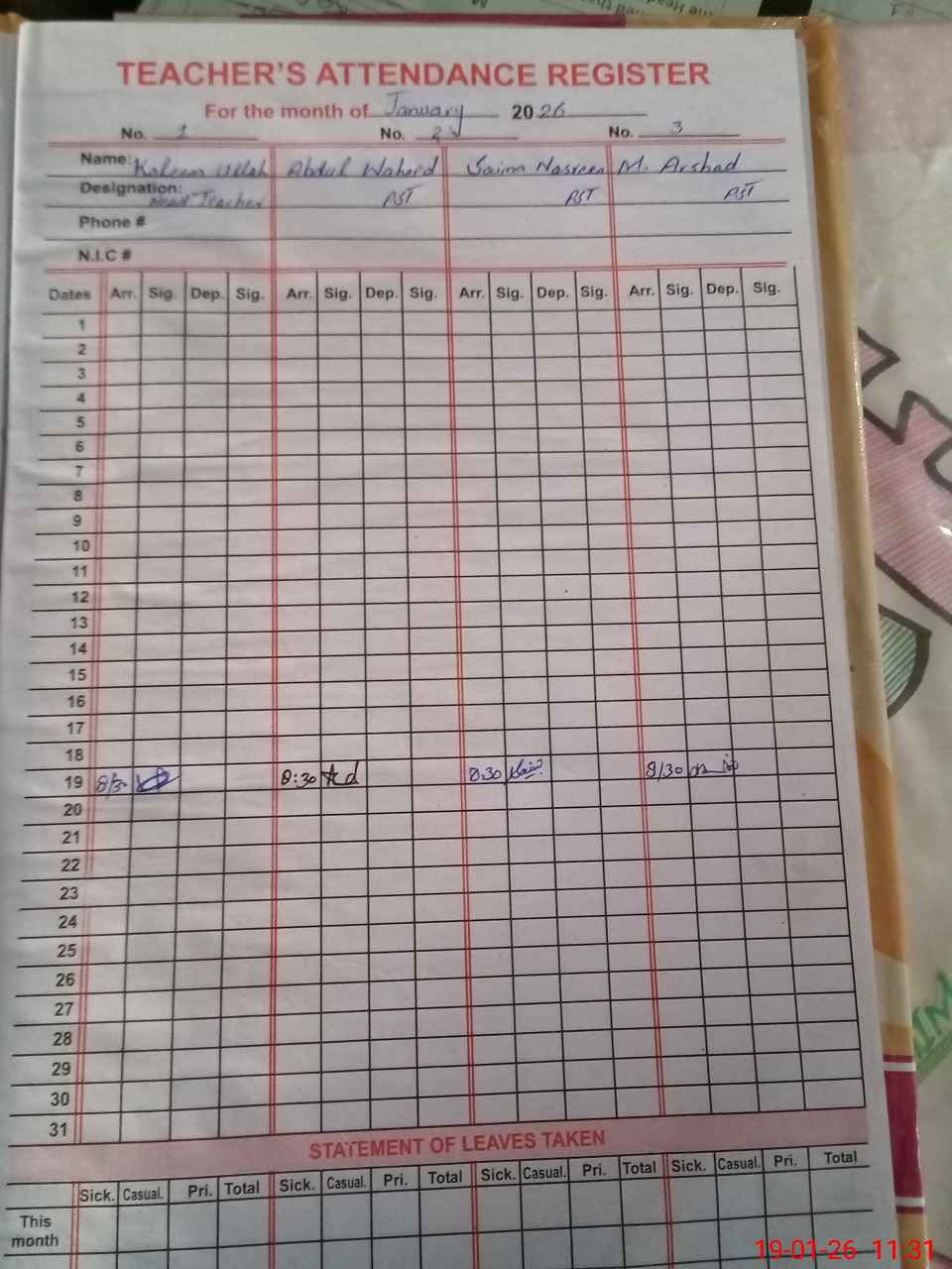 | CNIC | Full Name | Designation | R/C | Absence During Last Calender Month |