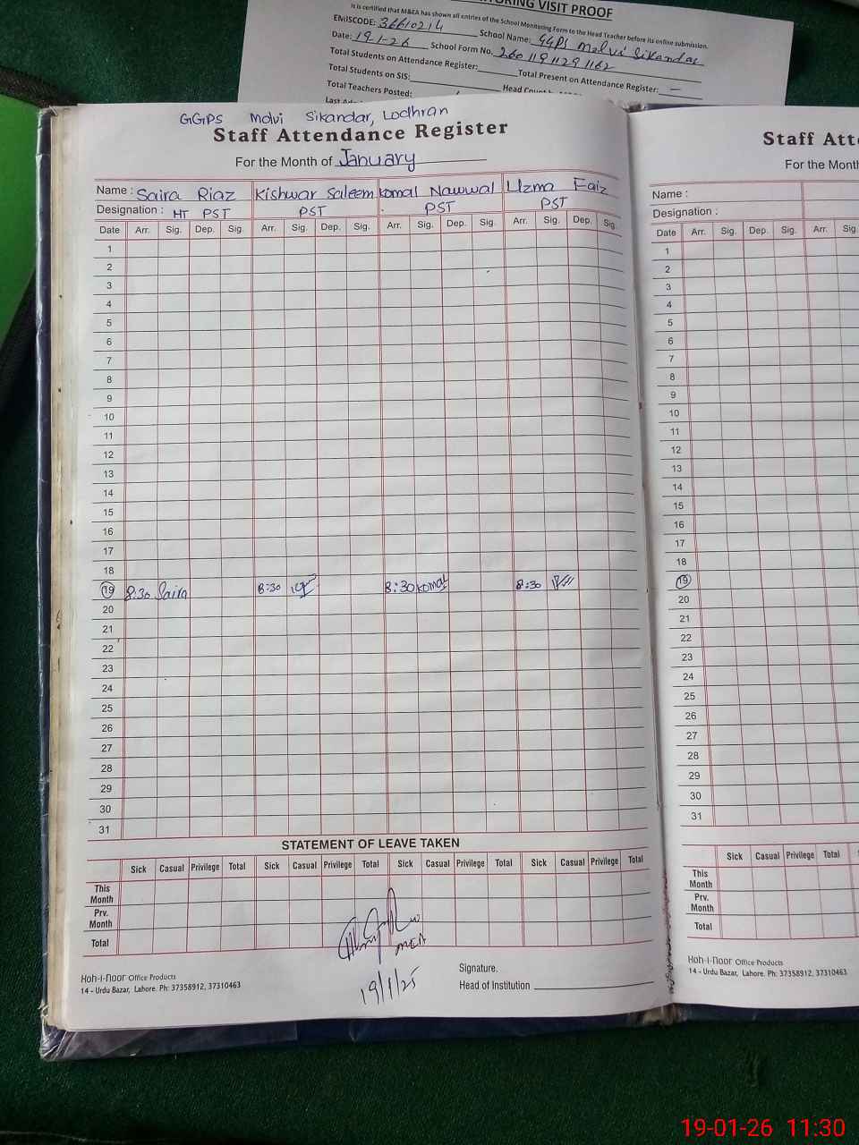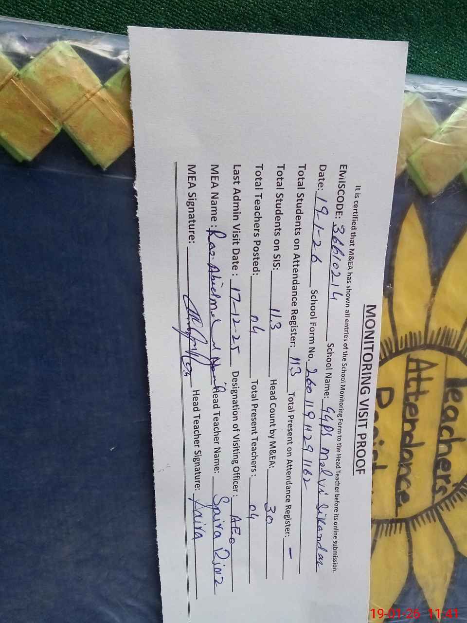 | Attendance Register | Head Teacher | MEA with School | Visit Proof |