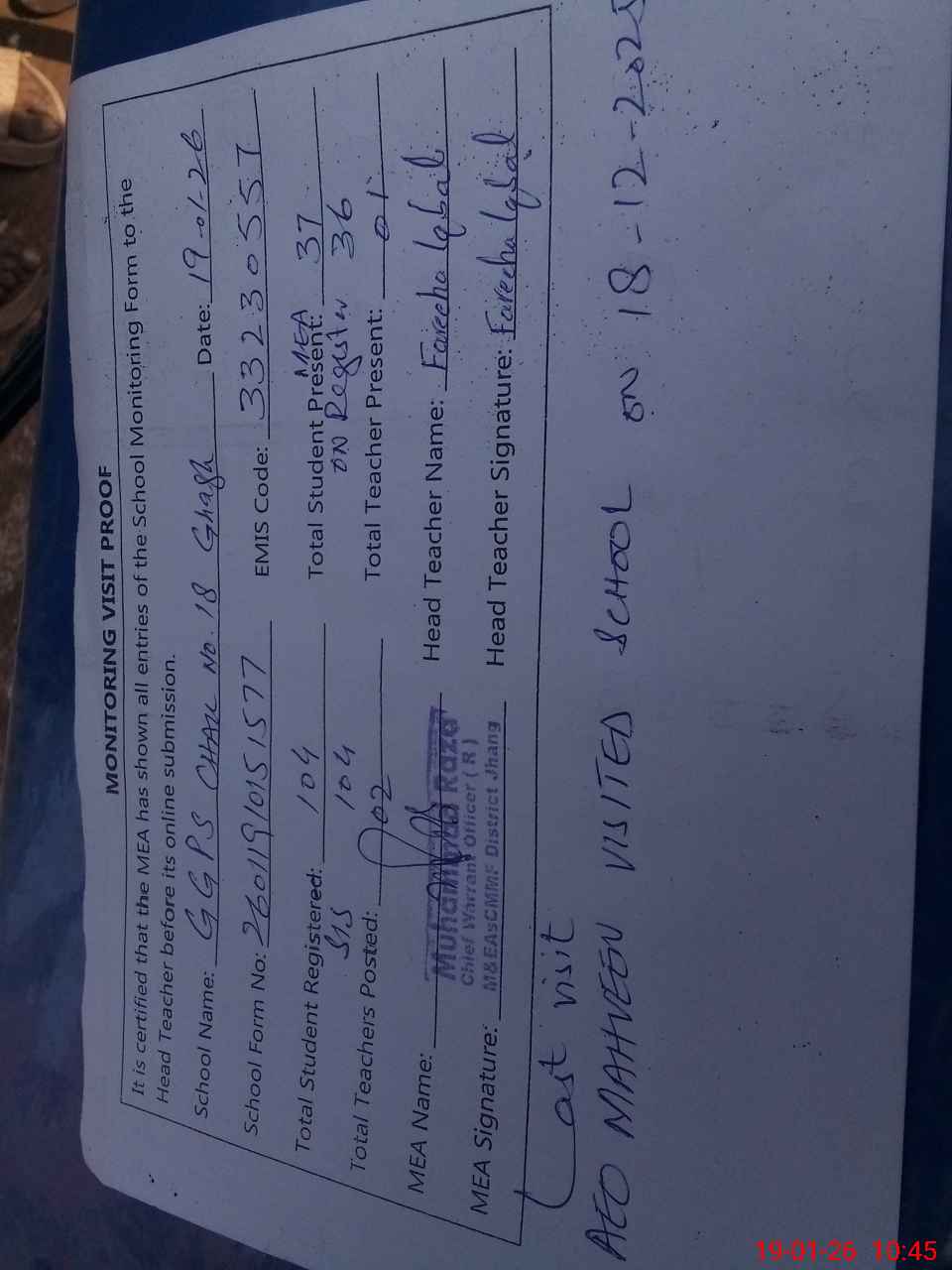 | Attendance Register | Head Teacher | MEA with School | Visit Proof |