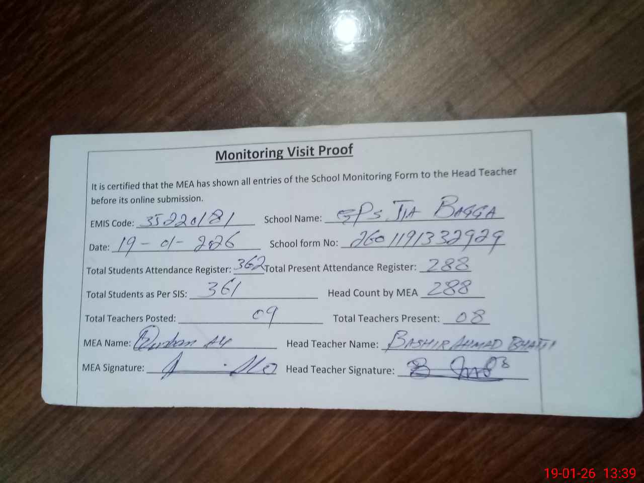 | Attendance Register | Head Teacher | MEA with School | Visit Proof |