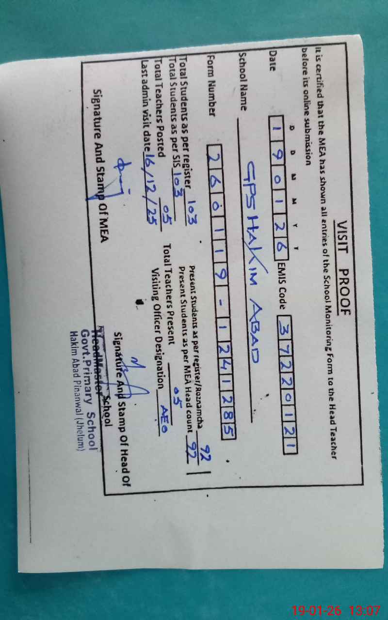 | Certified that this School was Inspected by the Undersigned MEA/DMO Today and the Information Stated Above is as Per Record. | |||||