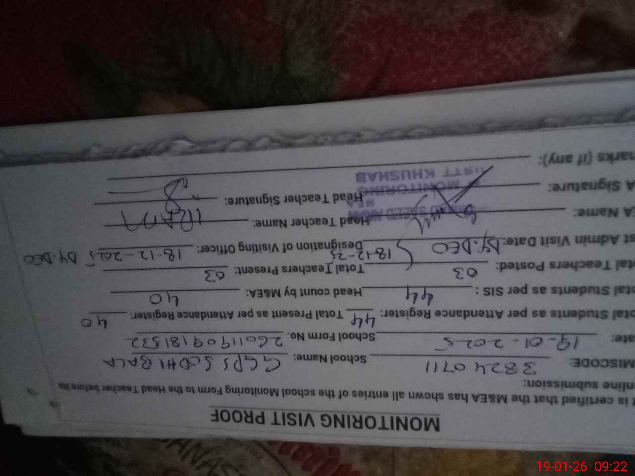 | Remarks (Use Separate Page if Required): Students on SIS Qty 44 Last admin visit On 18 December 2025 by Dy DEO | |||||
