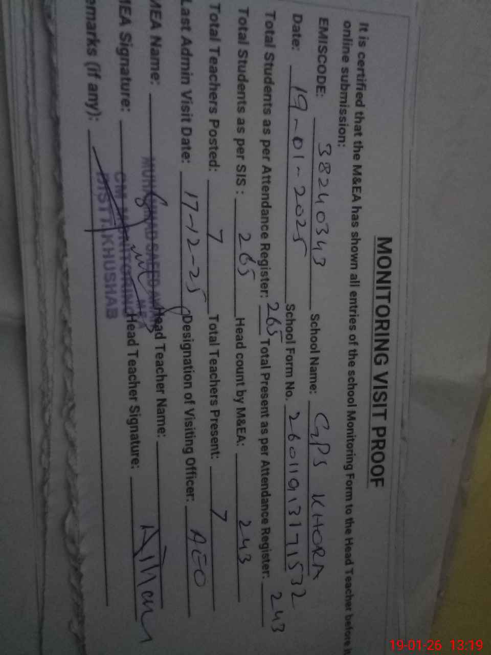 | Remarks (Use Separate Page if Required): Students on SIS Qty 265 Last admin visit On 17 December 2025 by AEO | |||||