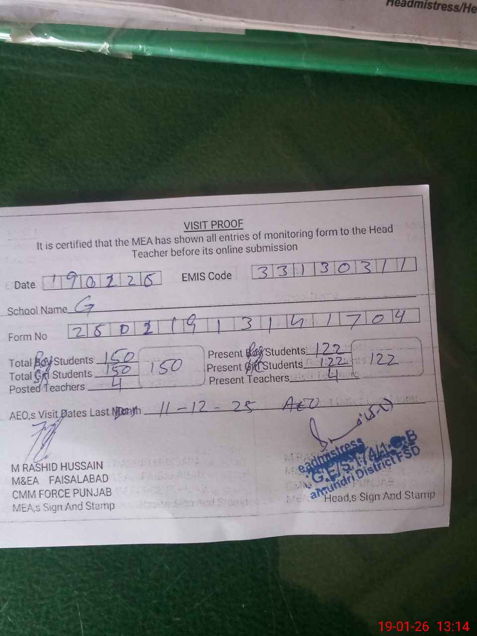 | Attendance Register | Head Teacher | MEA with School | Visit Proof |