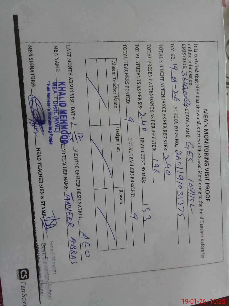 | Attendance Register | Head Teacher | MEA with School | Visit Proof |