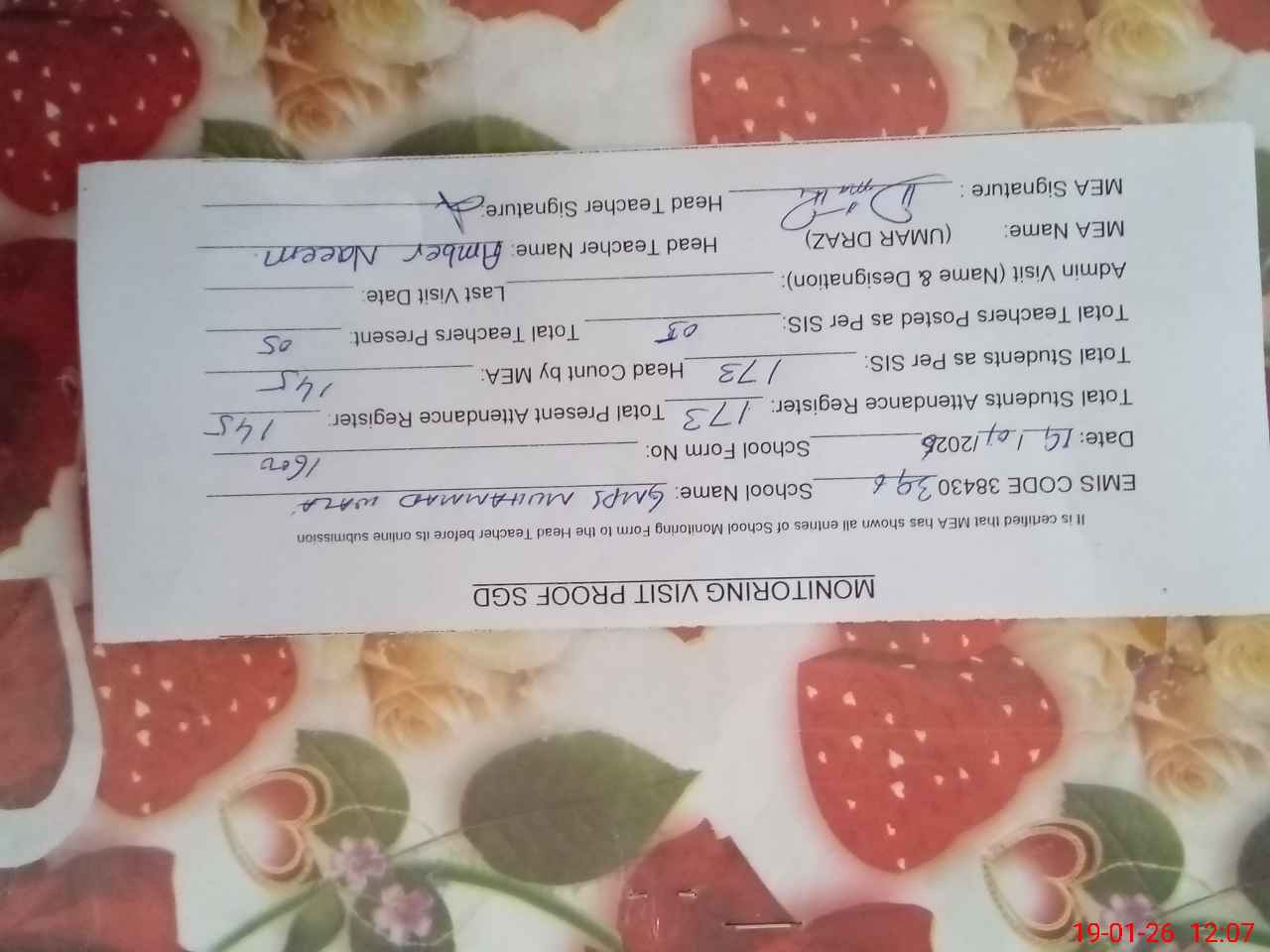| Certified that this School was Inspected by the Undersigned MEA/DMO Today and the Information Stated Above is as Per Record. | |||||