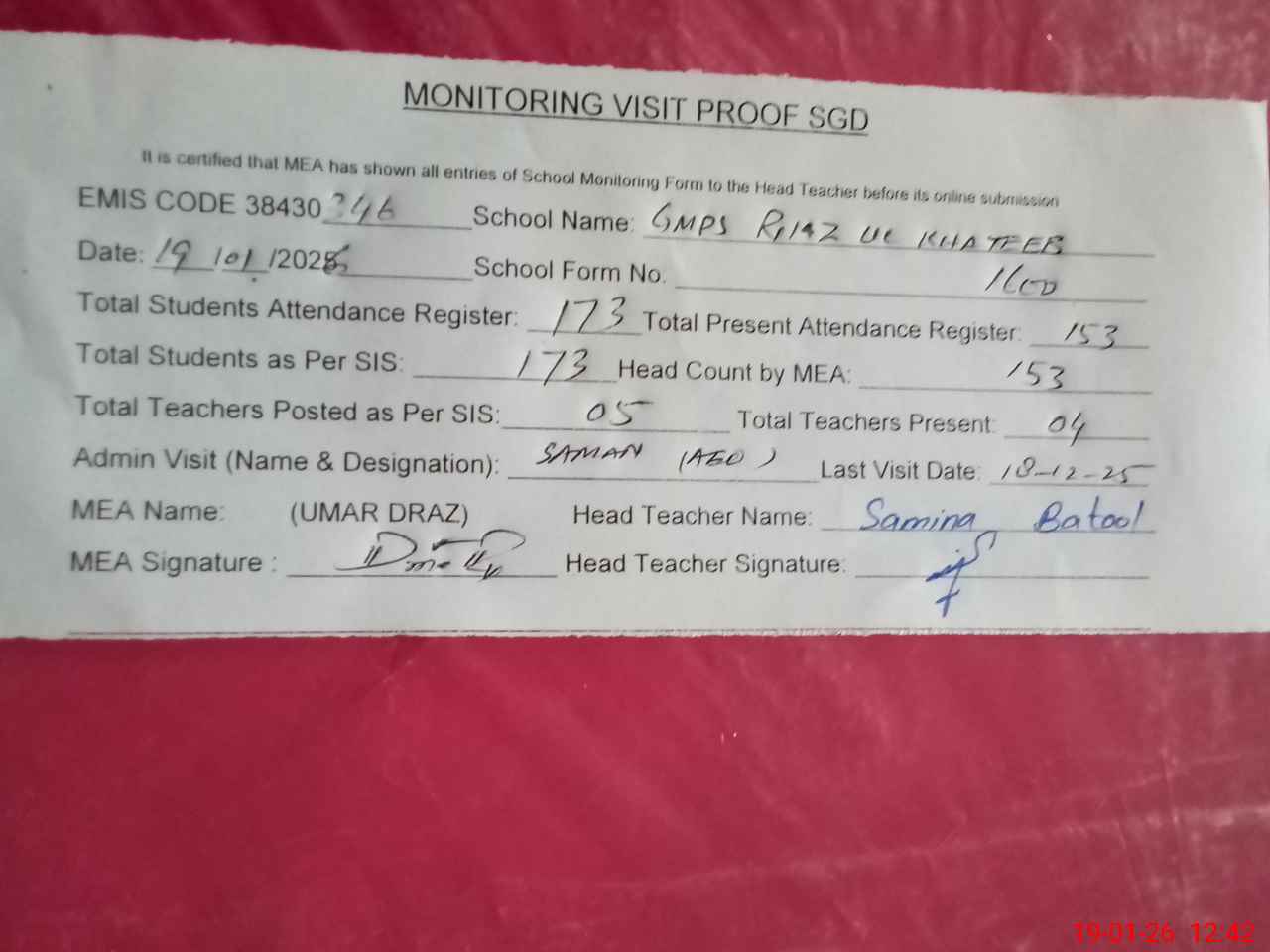 | Attendance Register | Head Teacher | MEA with School | Visit Proof |