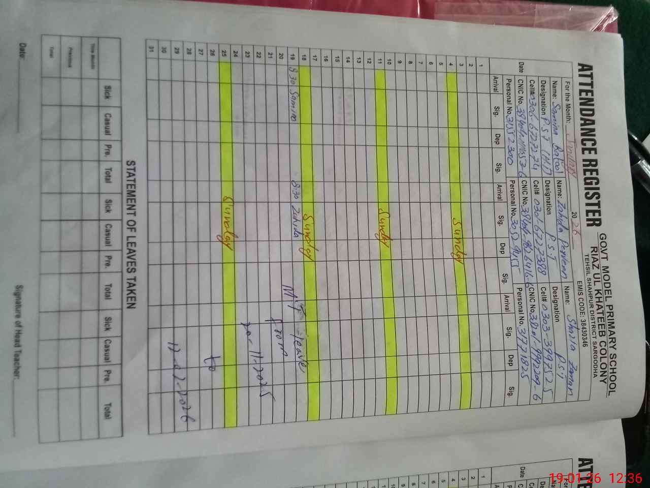 | 38**** | Sh**** Za**** | PST Science/Maths | Regular | 31 | 0 | 0 | 31 | 0 | 0 | 0 | 0 | 0 | Maternity |