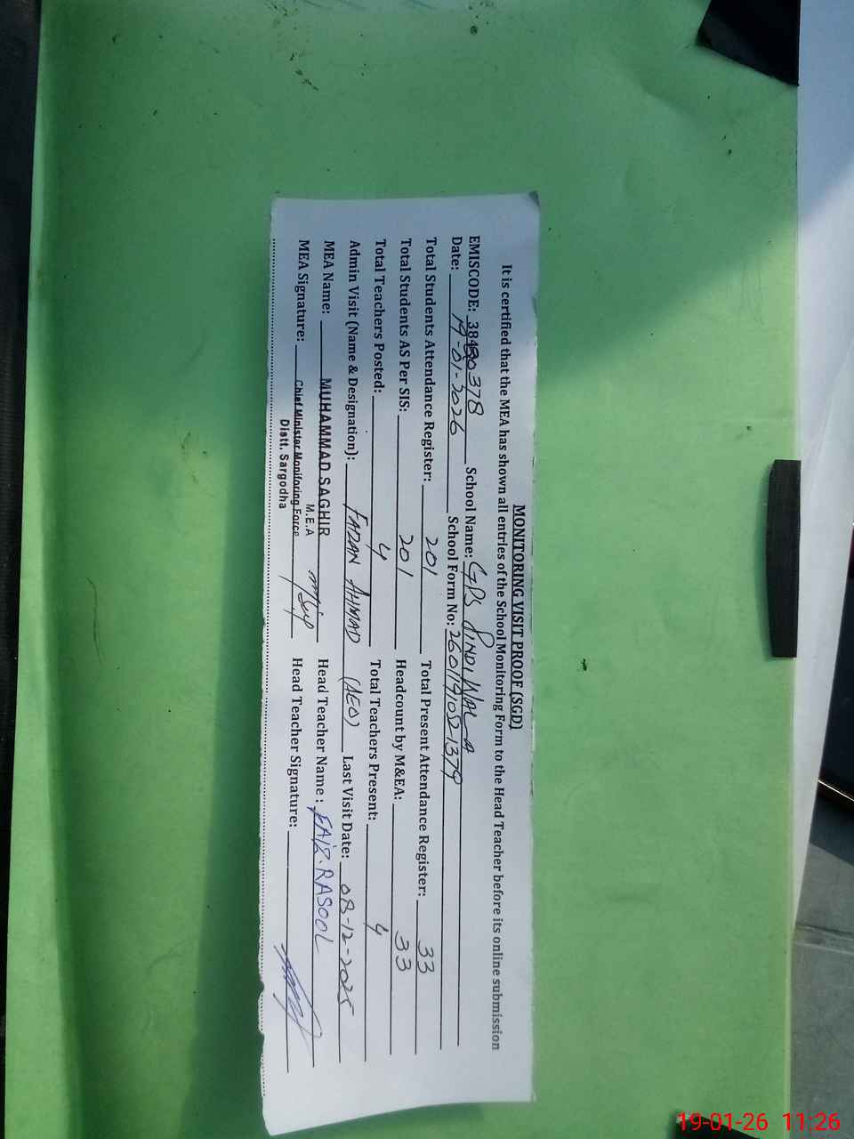 | Attendance Register | Head Teacher | MEA with School | Visit Proof |