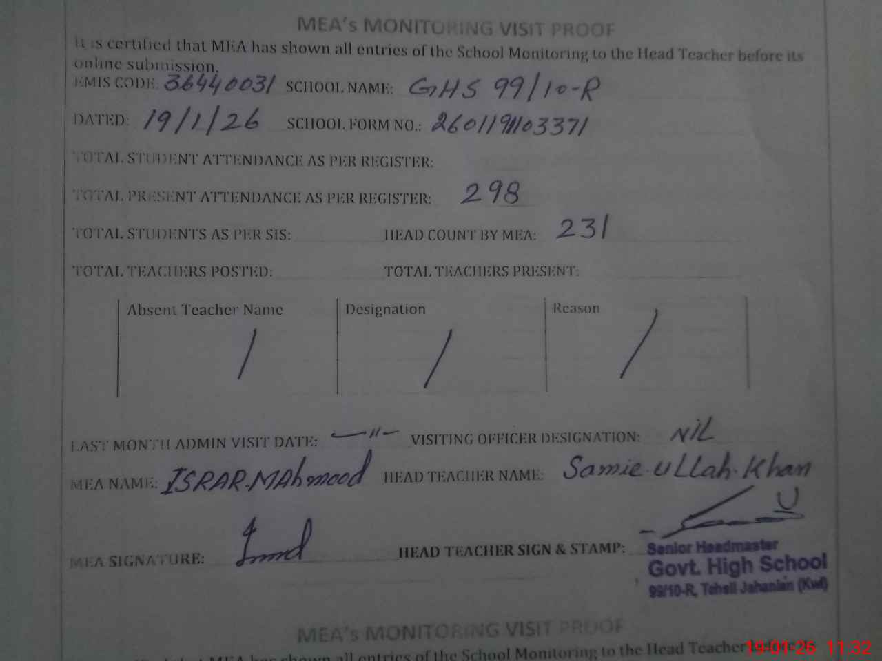 | Attendance Register | Head Teacher | MEA with School | Visit Proof |