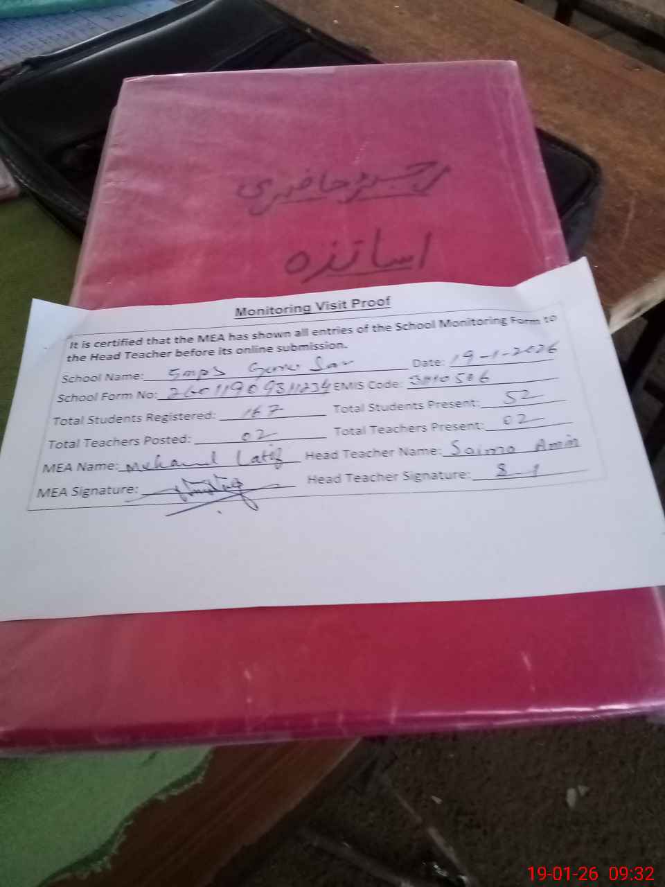 | Attendance Register | Head Teacher | MEA with School | Visit Proof |