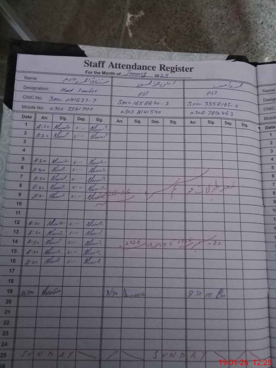 | CNIC | Full Name | Designation | R/C | Absence during last cal. month |