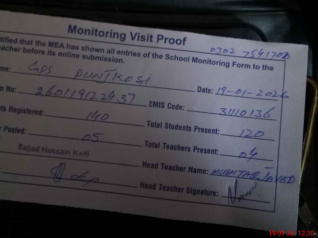 | Name: Mu**** Ah**** Ja**** Designation: (School Headmaster's/Headmistress's) PST Phone/Cell Number: 03**** |