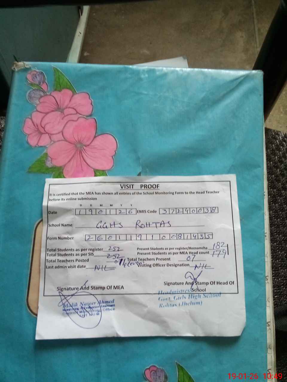 | Certified that this School was Inspected by the Undersigned MEA/DMO Today and the Information Stated Above is as Per Record. | |||||