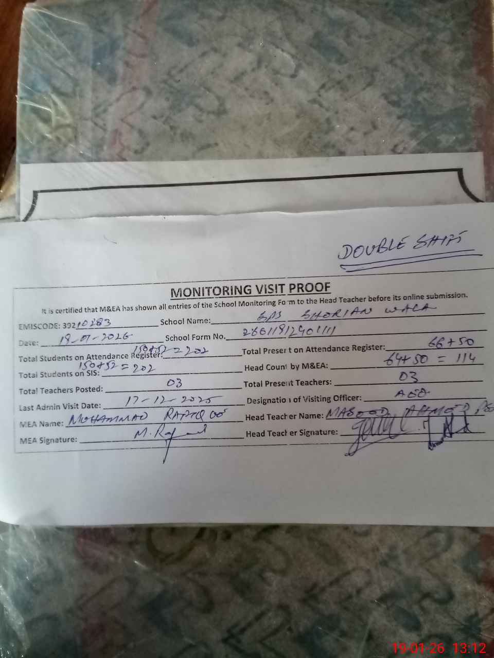 | Attendance Register | Head Teacher | MEA with School | Visit Proof |