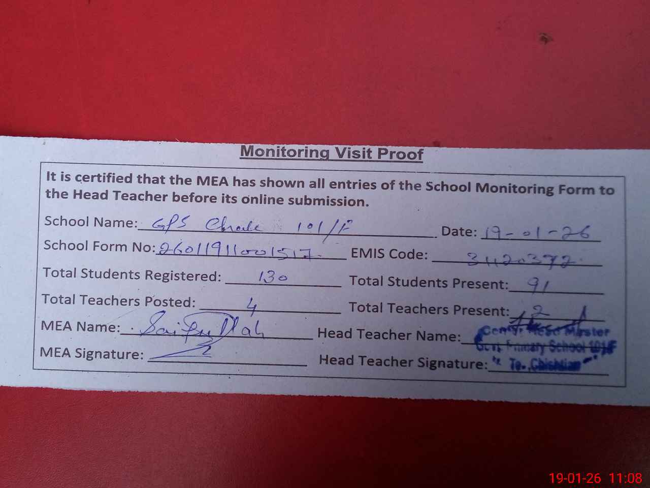 | Attendance Register | Head Teacher | MEA with School | Visit Proof |