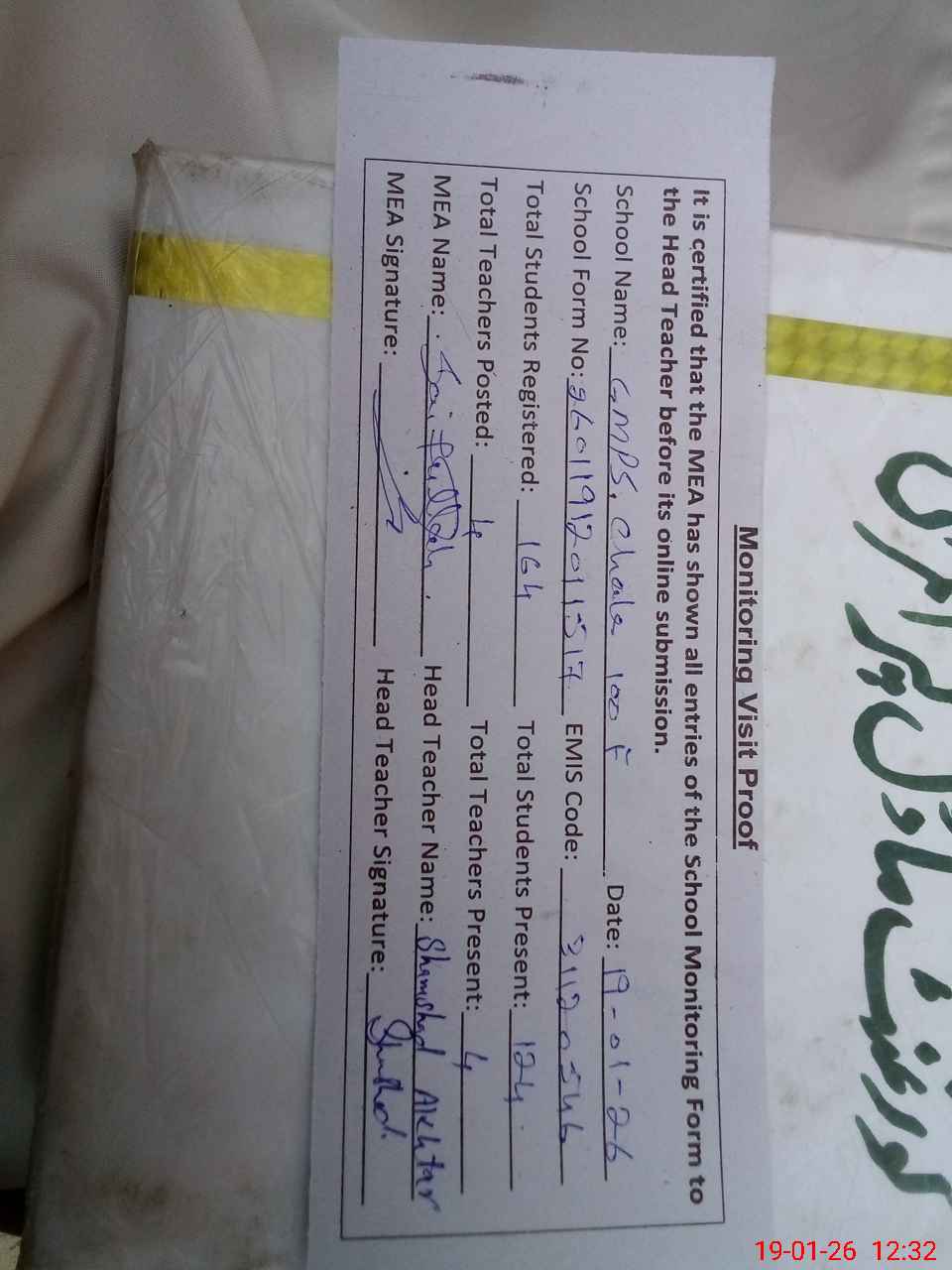 | Attendance Register | Head Teacher | MEA with School | Visit Proof |